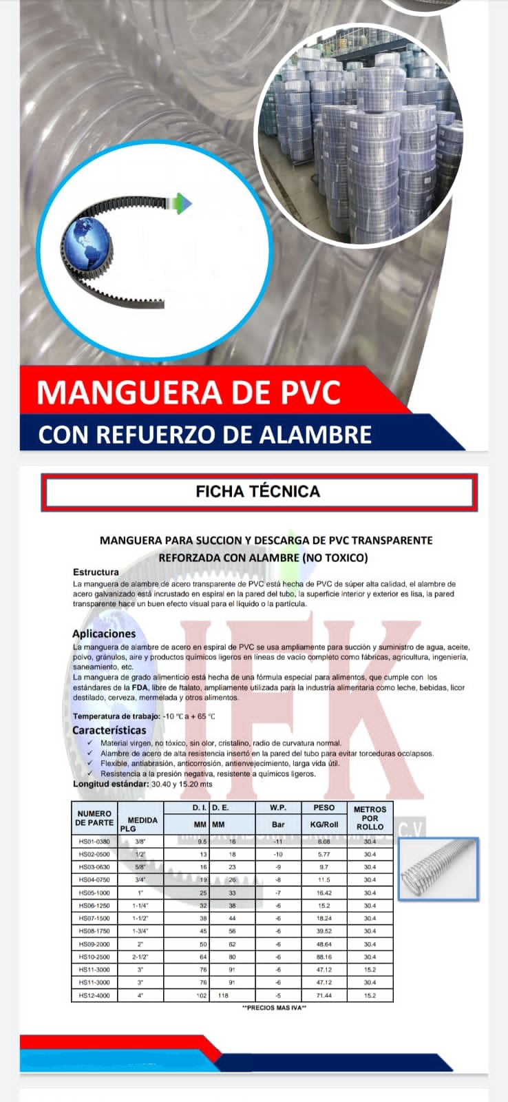 MANGUERA PARA SUCCION Y DESCARGA DE PVC TRANSPARENTE